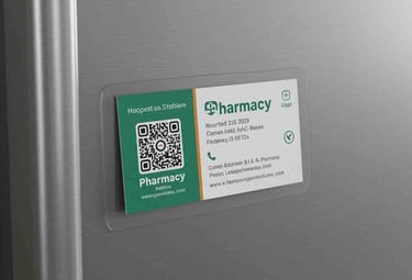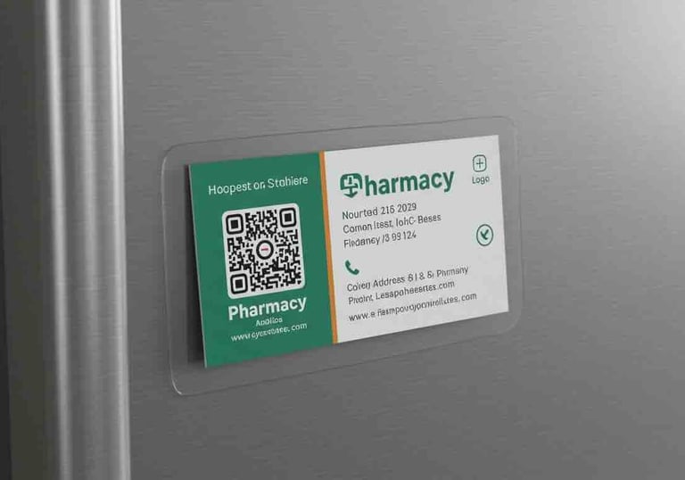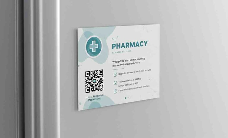 Durable, full-color fridge magnets with your pharmacy’s logo, contact info, and a QR code linking to your digital page.